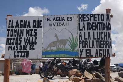 De nombreuses affiches contre le danger pour ces salars : l'exploitation du lithium (ici, et en Bolivie)