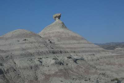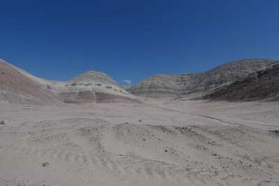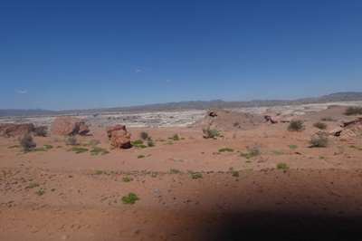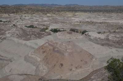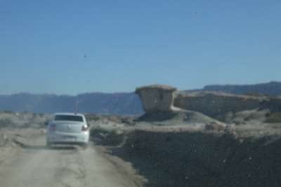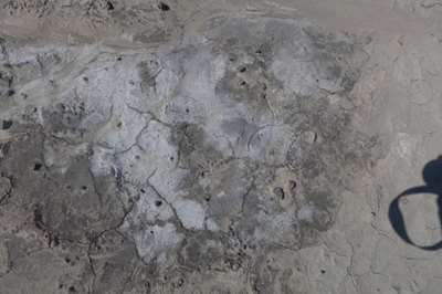 Ces dépôts blancs sur le sol sont de la bentonite : une argile blanche très fine, qui a la propriété de coller quand elle mouillée. Très recherchée dans la région