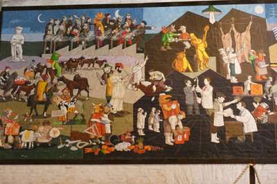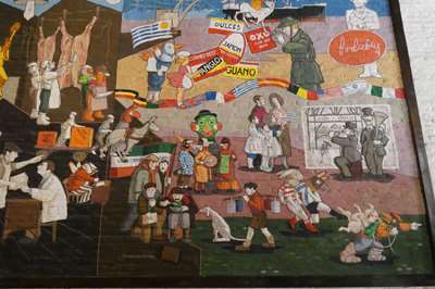Une magnifique frise retrace le parcours de la vache dans l'entreprise : son arrivée, son abattage, son découpage et l'utilisation des différentes parties pour la fabrication des produits : bouillon, le corned beef ..