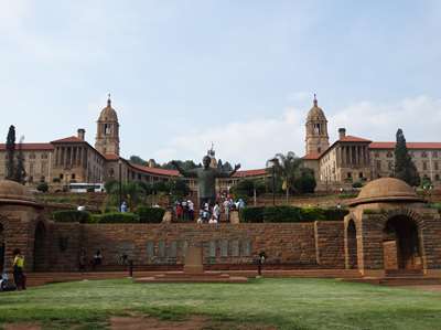 Au pied de ces bâtiments, la statue du héros national où les Sud-Africains noirs viennent se photographier.