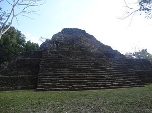 Surgissant dans une clairière, une pyramide récemment restaurée... mais d'un seul côté