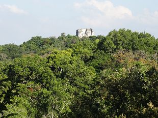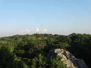 Nous grimpons en haut de la plus grande des pyramides. Là, surgissant de la jungle, quelques sommet de pyramides