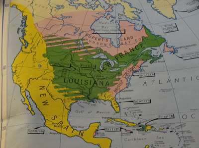 En vert, les possessions françaises, en jaune celles des Espagbols, avant l'arrivée des Anglais
