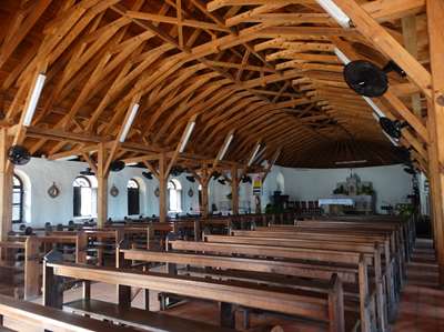 Derrière l'église part un sentier raide mais court (en fait un chemin de croix pour ceux qui connaissent) qui offre une vue imprenable sur la baie (mais acun abbé en vue) Remarque l'ilôt pointu que l'on aperçoit au milieu de la photo et qui donne son nom au village suivant
