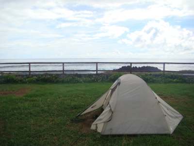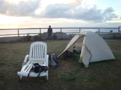 Transfert au camping, installation face à l'océan, et nous voici bloqués dans la cuisine : il tombe des trombes d'eau !