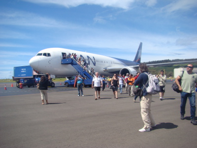 C'est dans la nuit noire, à 6 heures du matin, que nous bouclons nos sacs : plus d'électricité dans l'appartement. Marche à pied, métro, bus pour l'aéroport, embarquement... 9 heures 30 : on s'envole vers l'île de Pâques.
