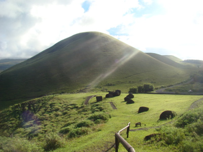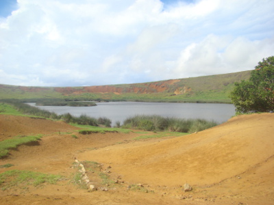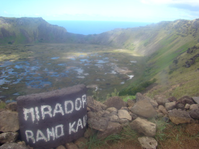 Pour aller à O'Rongo, il faut monter le long de la paroi du volcan Rano Kau ; la montée semble un peu raide pour l'éclopé, mais au bout d'une heure et demie, on arrive au cratère et là, plein les mirettes ! Un spectacle hors du commun !