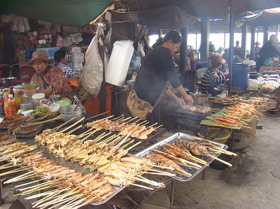 Dans le marché, des vendeuses et de la friture