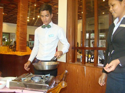 Nous avons commandé une "crêpe suzette" qu'un jeune apprenti prépare devant nous. C'est sa 1° fois !!!