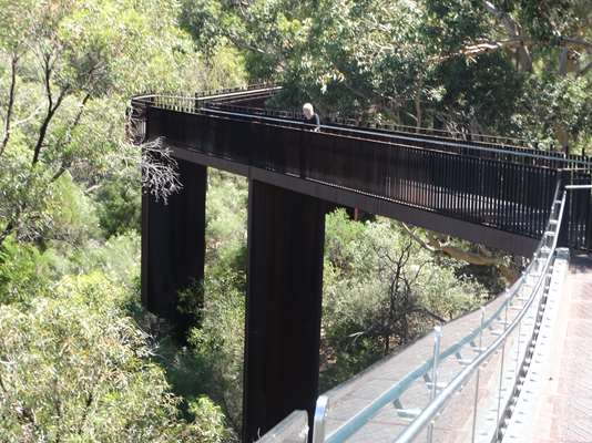 pour arriver à la gare de Perth, qu’on aperçoit ici en bas ; à l’arrière plan, le centre ville