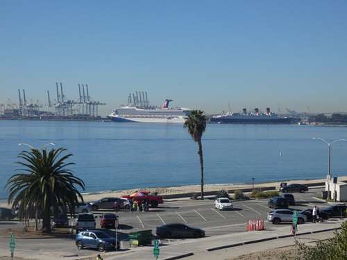 Un bateau de croisière, et à sa droite, le Queen Mary devenu hôtel