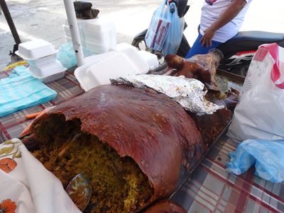 Avant de prendre le bateau, une "lechona" (genre paella, dans un porc éviscéré et vidé)
