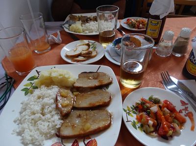 Avant de partir, nous avons mangé au même restaurant qu'avant-hier (truite pour mamie et porc à l'ananas)