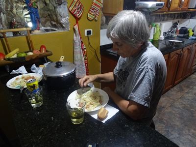 Le meilleur restaurant de notre voyage : tout cela (salade, soupe, lomo à la sauce à l'ananas, riz, purée, dessert et jus) pour 4€