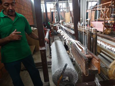 Notre guide, un peu pressé car il avait une réunion de la coopérative à 5 heures, nous a expliqué le processus de fabrication : on part de la plante dont les "feuilles" sont écrasées pour obtenir les fibres (cela dans les fermes) ; ces fibres arrivent à l'usine où elles sont colorées puis démêlées (cardées) en les peignant avec des clous.