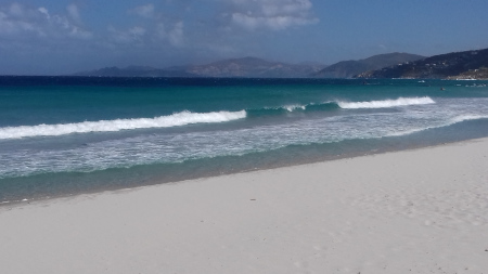 Ici aussi une superbe plage de sable blanc ; à l'arrière plan, les Agriates