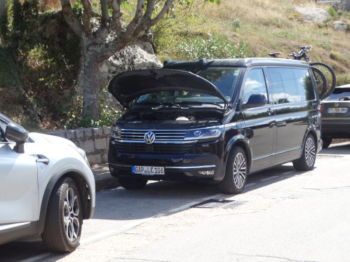 Voici un beau "California" en panne ??? Non, les deux jeunes Allemands qui le conduisent ont découvert, caché dans le moteur, un chaton. Ils sont bien embêtés ; nous repasserons une heure plus tard et le chaton est toujours dans le moteur ...