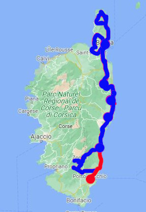 Une halte à Pinarello qui nous donne à voir son golfe. Déjà beaucoup de monde, stationner devient compliqué et le prix des cafés s'envole. Nous approchons du sud ...