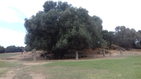 De nombreuses statues menhirs ont été retrouvées, puis redressées, comme ici autour de cet olivier qui est daté de 1200 ans