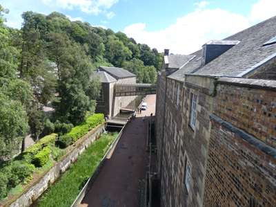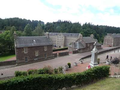 Un arrêt obligatoire pour nous et nos idées : en 1800, Robert Owen, reprenant l'affaire de filature de son beau-père, a implanté dans la vallée un concept de vie sociale idéale : école obligatoire jusqu'à 10 ans, soins médicaux gratuits, un atelier d'apprentissage, une crèche, une cantine publique, une coopérative d'achat, des cours du soir !
