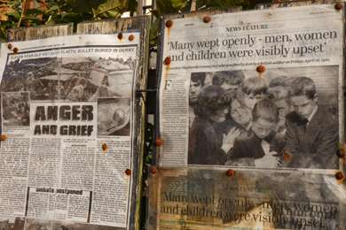 Sur un mur, ces articles de presse qui rappellent la mort d'un gamin de 10 ans, tué par une balle en plastique de l'armée britannique