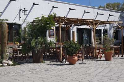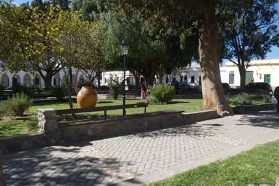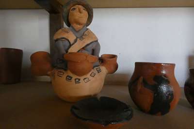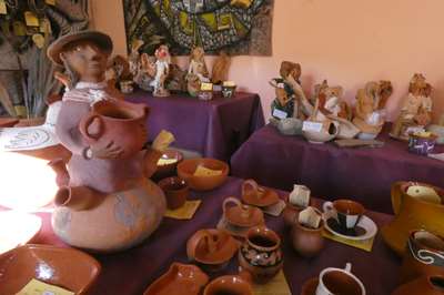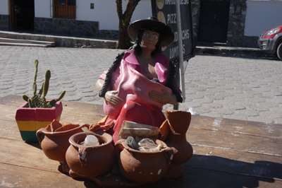 Devant un restau, une pachamama en argile et ses récipients pour recevoir les offrandes
