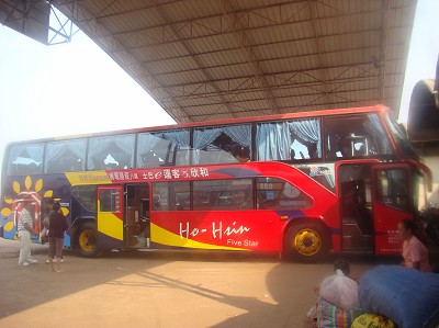 Nous avons pris un bus local, mais qui s'avère confortable. Evidemment, il s'arrête sans arrêt, il est hyper-complet (il y a des tabourets en plastique dans le couloir) et bien bruyant... Nous y passons 6 heures .