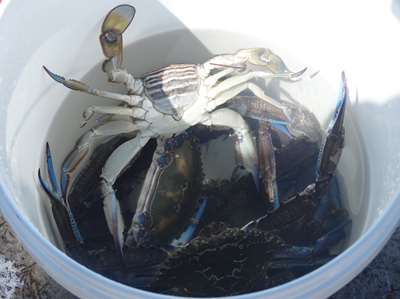 Nous apercevons la jetée du petit port ; nous sommes intrigués par la quantité de pêcheurs qui s'y trouvent : en fait c'est un haut lieu de la pêcheau crabe