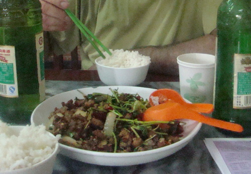 derrière la cité interdite, un petit restaurant au nom intraduisible qui nous sert du mouton sauté aux oignons et deux bols de riz (3 € chacun avec bière)