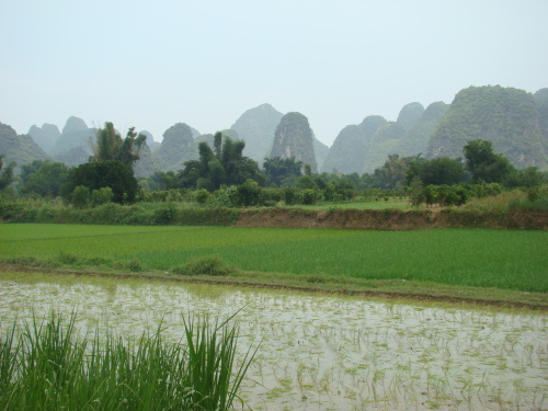 L'hôtel loue des vélos (2 €) et avec une carte pas très précise, nous partons à la découverte de la campagne et de la rivière Li par le nord .