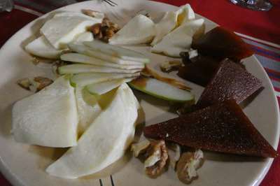 En guise d'apéro, fromage et pâte de coing (membrillo) sur la nappe basque de Chantal