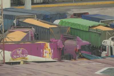Au port, livraison de blé, emporté par des camions