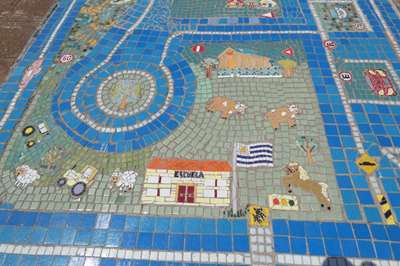 Au sol, une mosaïque sensée représenter l'Uruguay. Au premier plan, l'école publique. L'Uruguay a le meilleur taux d'alphabétisation de toute l'Amérique latine !