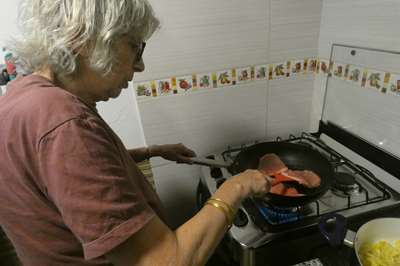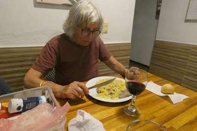 Aujourd'hui, c'est LE GRAND SOIR : mamie a une cuisine, et a trouvé de la viande (et du vin). On n'en a pas mangé depuis notre départ !!!
