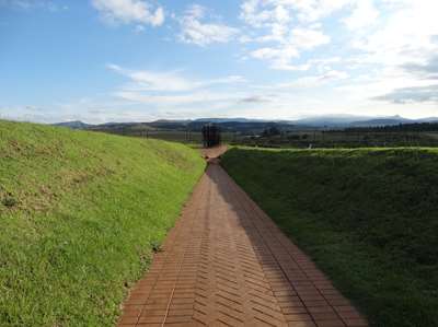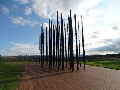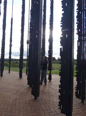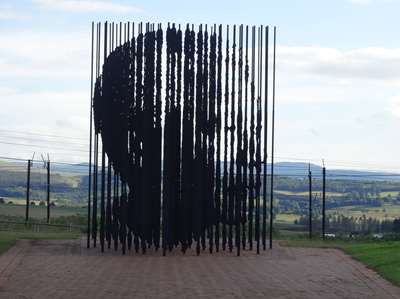 Au bout de ce chemin, (le chemin de la liberté ?) se dressent des tiges de métal (les barreaux d'une prison ?) qui si on les regarde d'un point précis dessinent le visage de Mandela ! Derrière, la route de l'arrestation