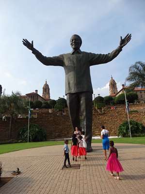Au pied de ces bâtiments, la statue du héros national où les Sud-Africains noirs viennent se photographier.