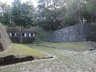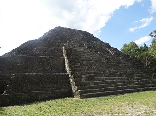 Surgissant dans une clairière, une pyramide récemment restaurée... mais d'un seul côté