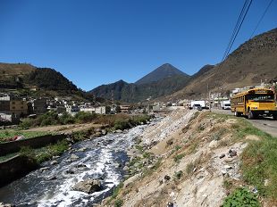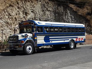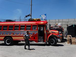 Un bus direct pour parcourir la petite centaine de km séparant les deux villes. Une conduite supersportive avec le chicken bus (appelé ainsi parce qu'ils sont jaunes comme les poussins. Ce sont des schoolbus des Etats Unis réformés et réutilisés ici) . On a serré les fesses pendant 2 heures et demie)