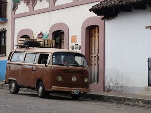 Journée de transfert, avec passage de la frontière Guatemala-Mexique. La journée a mal commencé : l'agence nous a simplement oubliés. Coup de téléphone : un taxi plus que déglingué vient nous chercher à l'hôtel et nous amène à un point de rencontre (15 km) où nous attend depuis trois quarts d'heure le minibus qui doit nous conduire à la frontière. Là, changement de minibus et route jusqu'à San Cristobal de las Casas. En tout, 7 heures.