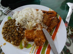 Le repas, rien de bien original : porc, riz, lentilles et banane