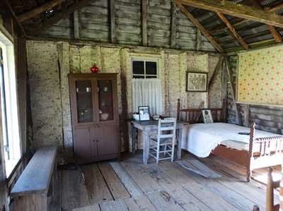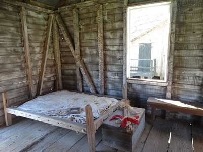 et la barraque "à vivre" avec ses sommiers à cordes, ses fenêtres sans vitres et les journaux aux murs pour protéger des courants d'air