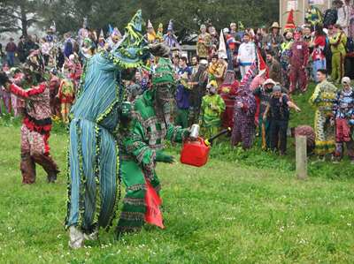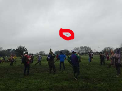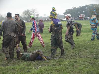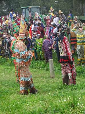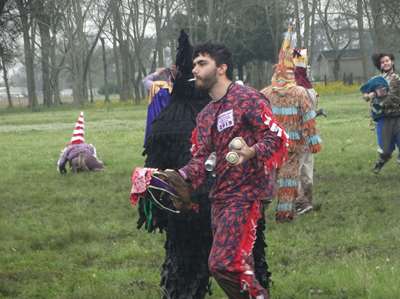 Tout le monde est en place, le jeu peut commencer. Le jeu consiste à attraper les poulets que lancent les organisateurs. Mais les poulets volent, affolés, dans les bois parfois. La prairie est gorgée d'eau ......