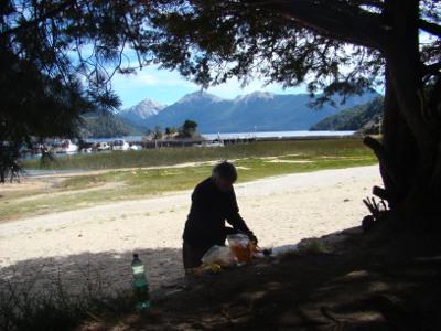 Dès le col franchi, une bruine tombe qui devient rapidement de la pluie drue..Il ne fait pas froid à El Bolson, mais il tombe des cordes. Nous tournons un moment en rond, cherchant un hôtel (mais rien), décidant de dormir au camping dans la voiture. Une accalmie nous laisse juste le temps de monter la tente ; nous avons tout à coup 35 ans de moins ; et les campeurs ont eux aussi (mais réellement) 35 ans de moins.