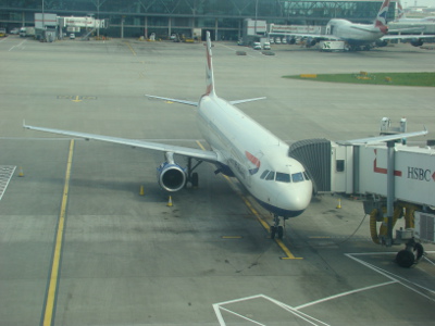 Journée de transport et de décalage horaire (5 heures avec la France) ; d'abord un bus de ville pour l'aéroport : 2 heures d'arrêts et de départs... Puis l'avion de nuit pour Londres où nous arrivons à 7 heures locales (13 heures de vol)