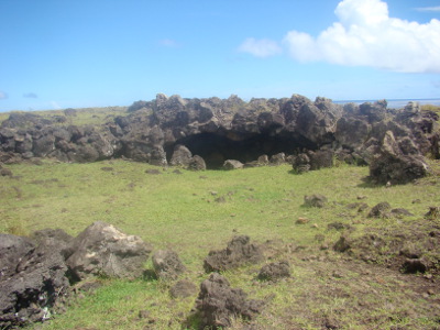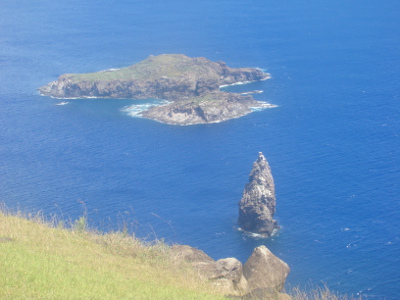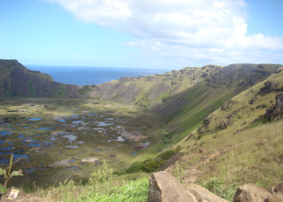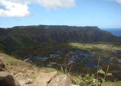 Pour aller à O'Rongo, il faut monter le long de la paroi du volcan Rano Kau ; la montée semble un peu raide pour l'éclopé, mais au bout d'une heure et demie, on arrive au cratère et là, plein les mirettes ! Un spectacle hors du commun !