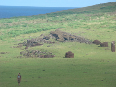 Alors, nous partons l'après-midi pour Vinapu (en fait nous faisons le tour de la piste d'atterrissage) voir un site moaï important qui se trouve à quelques 5 km. Mais les statues ont été renversées au cours de guerres tribales, au XVII°.