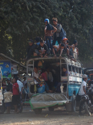 Aujourd'hui, c'est la fête de la pleine lune. Tout ce qui a 2, 3, 4, 6 ou 8 roues est de sortie pour amener les gens de pagode en pagode porter des offrandes pour que Bouddha soit content. Et ça chante sur les camions, et ça danse... Seul le Père Noël de Naïla sur son skate ne roule pas.