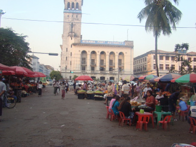 A la descente du train, nous partons vers le centre-ville de Yangon (ancien Rangoon) qui n'est plus la capitale administrative depuis la junte (2007) qui a créé, pour la remplacer, une ville au centre du pays (Naypyidaw)