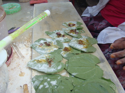 Le bétel qu'ils mâchent, mélange de noix de bétel, du tabac, de la chaux le tout plié dans une feuille de bétel
