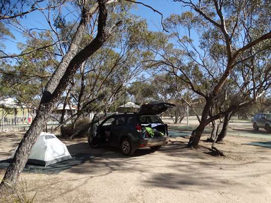 Wave Rock signifie la « vague rocher » ; nous nous installons au camping, (il y a de la place dans le frigo) et derrière nous, le rocher que nous irons voir demain matin à la fraîche (d’où l’arrêt précédent)